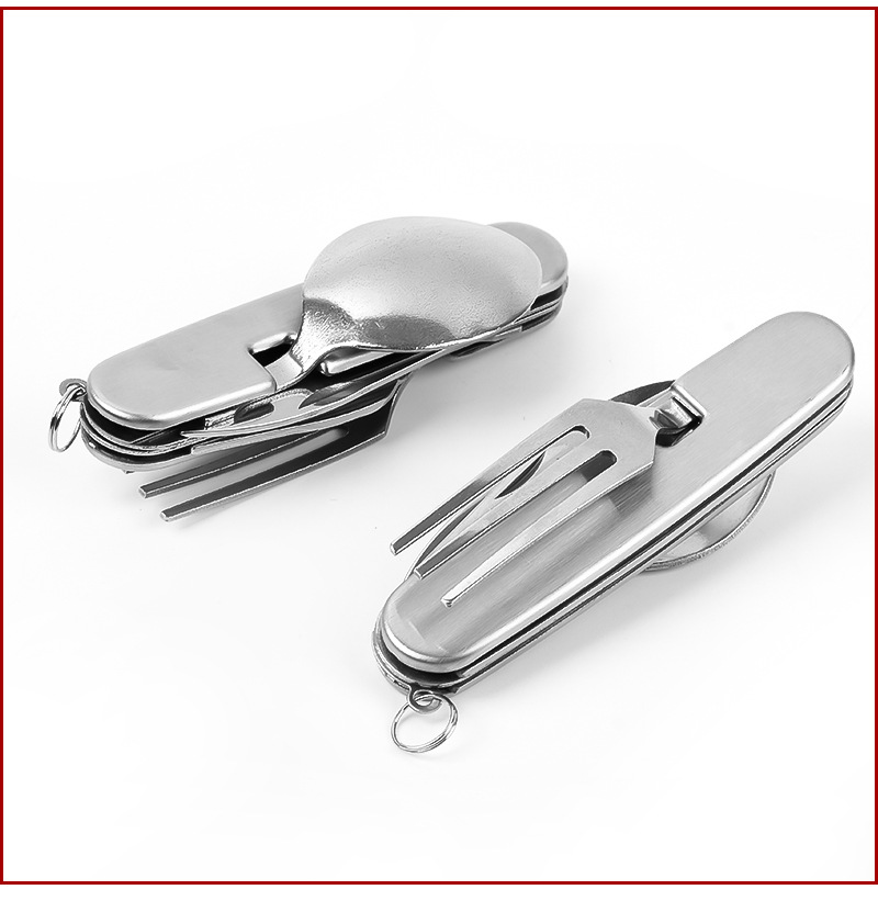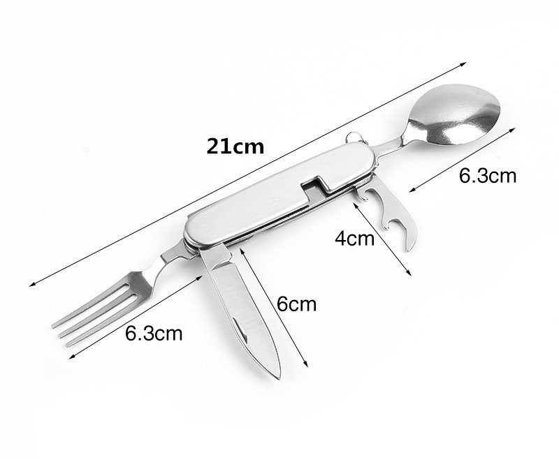 | Feature | Detachable design, includes spoon, fork, knife, bottle opener, folding for portability, compact cutlery set for travel, hiking, and camping. |